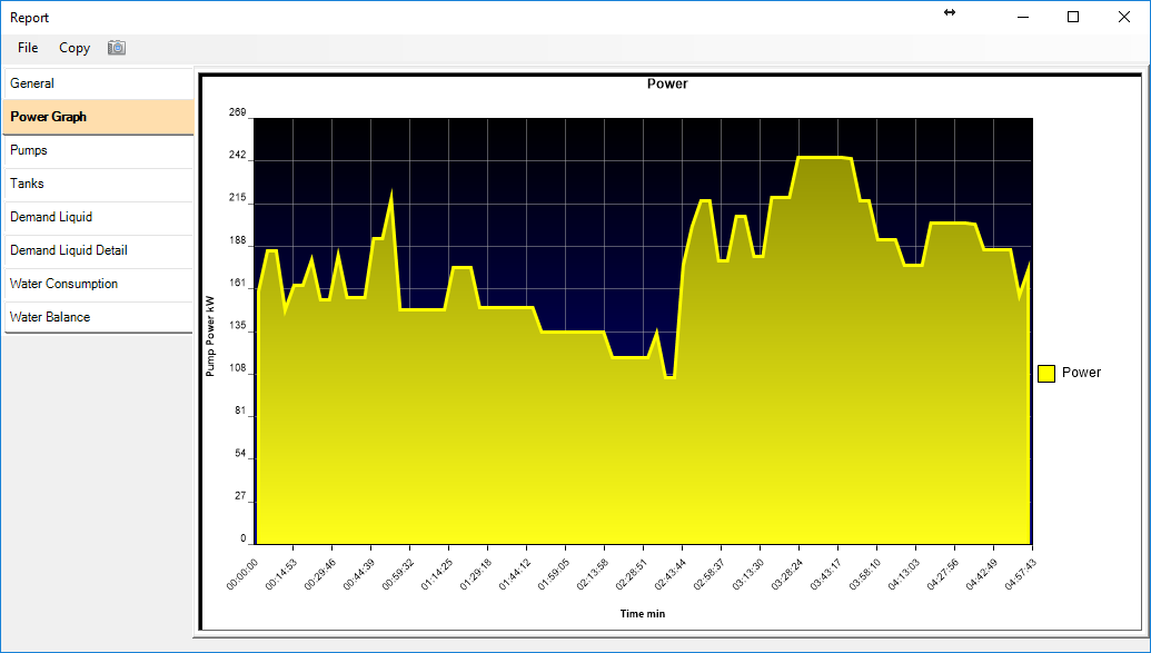 The dynamic report is a summary of the dynamic simulation. It allows a general overview of the model and helps identify possible issues in the system. All data can be copied to the clipboard using File>Copy to clipboard. Values can be sorted to highlight a specific issue. Opens a graph of the selected element.