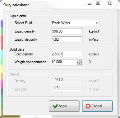 A slurry calculator is also available to simulate Newtonian slurry. First select the Liquid Data, either from the database or enter some custom values directly. Then enter the Solid data characteristics. The calculated density and viscosity results will be entered in the table by clicking Apply.