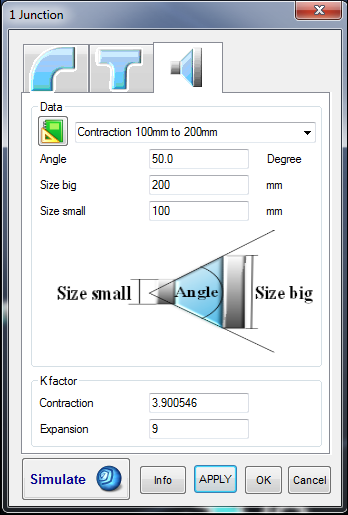 The resistance of the junction is automatically calculated from the angle and the two diameters. Pumpsimâ„¢ compares the two pipe diameters to determine if it is a contraction or expansion. The K factor for contraction and expansion is automatically calculated from the two diameters and the angle. They can be created as custom values.