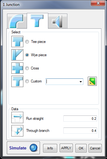 "Three and Four Way" Junctions are simulated from two values, one for the flow through the junction and one for the flow of the branch. For "Tee" and "Wye" pieces, Pumpsimâ„¢ uses the drawing to determine if it is a flow-through or branch flow. Junctions can be selected from the preset or entered as a custom value.