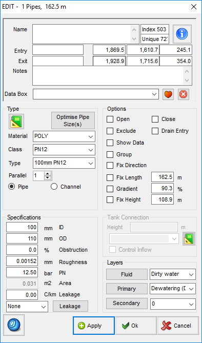 - Leakage – Amount of leakage per length. The leakage is specified by how much flow goes out of the pipe for 1bar of pressure per length of pipe.