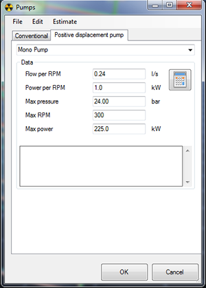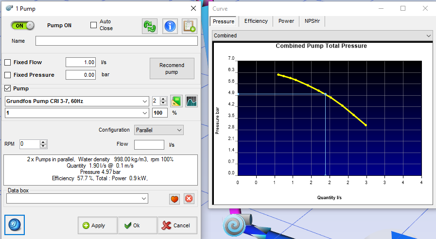 A pump can be added to simulate flow in a model. Power, efficiency and the pump duty point are calculated and provided in the EDIT box.