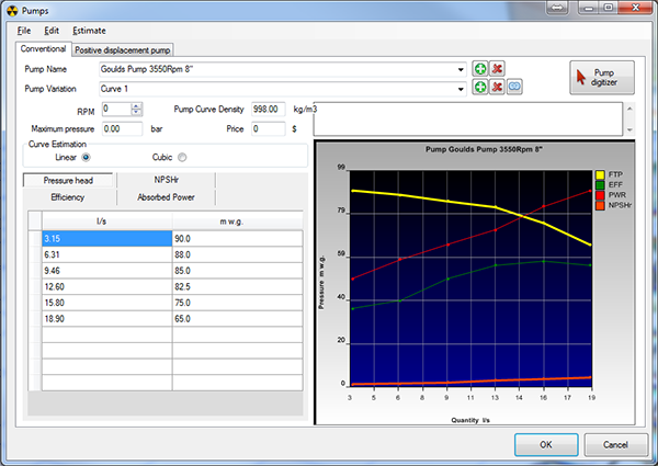 At a minimum, pump curve points for quantity and pump head must be entered for each pump. Other curve information such as efficiency, power and NPSHr can also be entered.