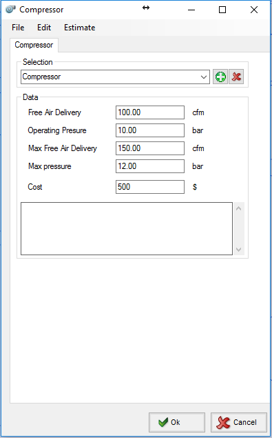 Compressors usually do not have a curve like pumps. To simulate them, enter the operating and maximum flow and pressure which must be available from the manufacturer. Pumpsim™ will then create a pump curve using those points.