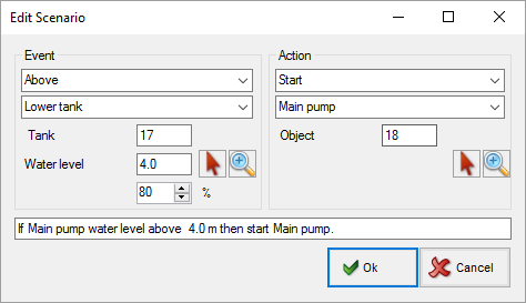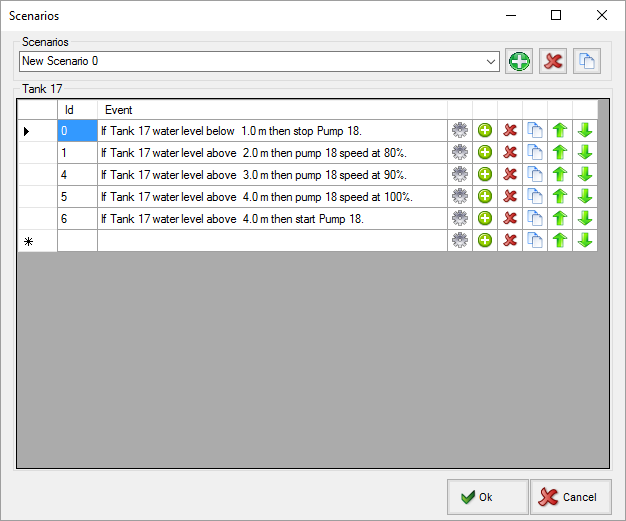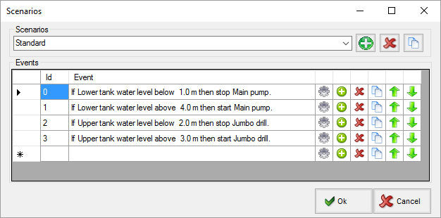 Scenarios are a feature of Pumpsimâ„¢ Advanced and are used during the dynamic simulation in order to automatically trigger actions in the model. Many scenarios can be added to a simulation. You can choose which scenario to run from the main Scenarios form.