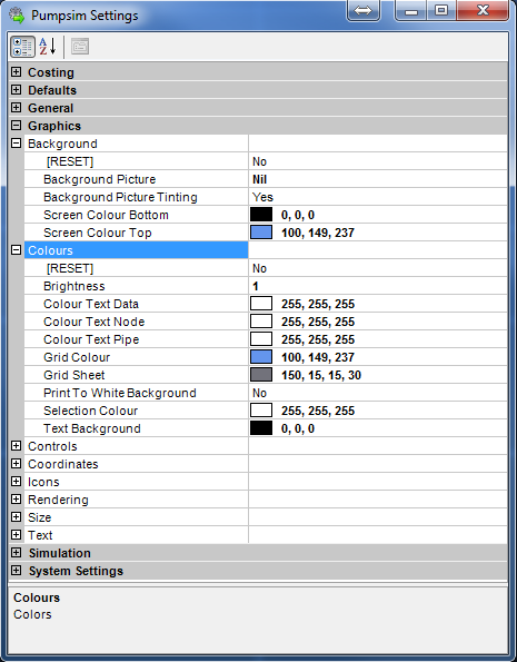 Fig. 5.2.4: The background and colours menu within the Pumpsim™ settings window.