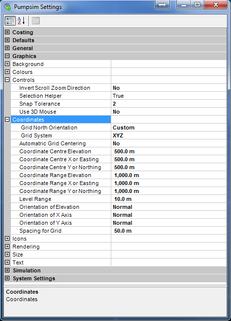 - Grid System – Most mines/models use a GRID NORTH system. Pumpsim’s coordinate convention when using grid north coordinates is Easting, Northing and Elevation in that order. If another type of system is used, then an XYZ system can be specified, which allows for orientation of coordinates in any direction.