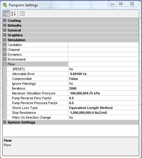 - Maximum Simulation Pressure – The maximum pressure the simulation will allow between waterways before a simulation error is reported. This error may indicate unreasonable fixed flows or resistances which interact and cause large pressure changes in the model.