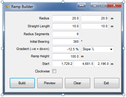 - Construct Ramp – A tool for quickly building spiral ramps. After selecting the tool, draw the initial direction of the ramp, and the ramp builder toolbox will show, allowing gradients, ramp bends, straights and heights to be established. A ramp can be previewed to try different factors before clicking BUILD to commit the ramp design to the model.