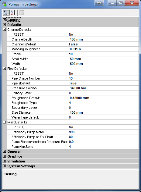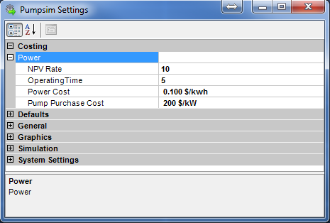 Settings provide control over a large number of parameters used in Pumpsim™ for simulation, graphical display and file handling. Settings are normally saved specifically within the Pumpsim™ model file, however they can be shared with other files using the INHERIT or MASTER LINK functions.