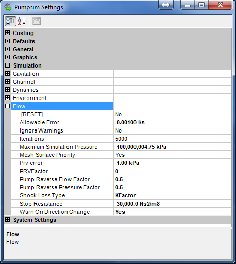 - Maximum Simulation Pressure – The maximum pressure the simulation will allow between waterways before a simulation error is reported. This error may indicate unreasonable fixed flows or resistances which interact and cause large pressure changes in the model.