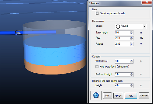 Tanks are defined by their dimensions, shapes and the level of water and sediment. The pressure loss due to the connection with a tank can be adjusted in the Pipe Edit Box.