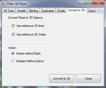 Hint: To convert a multi-seam or level model to 3D using this function, individually group-select the pipes required, and ensure only the relevant 3D DXF object for that level is turned on before conversion.