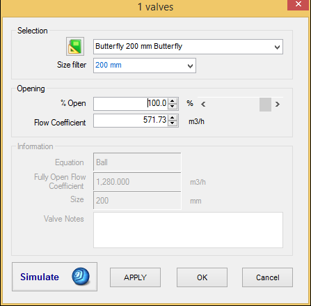 - Selection – Valve name, including the size and type. More valves can be added in the presets.