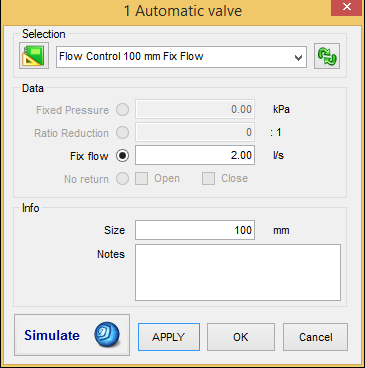 - Fix Flow – Fix the flow across the valve. If the set flow is higher than the flow with the valve fully open, the valve will be fully open.